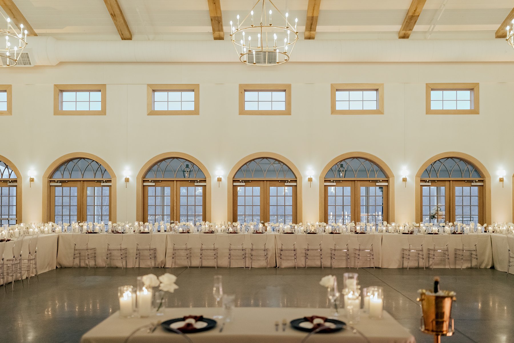 As an event planner herself, Rachel has spent years creating beautiful celebrations for others, and when it was finally her turn, she chose Westwind Hills as the perfect venue. Designed with both luxury and versatility in mind, the 11,000-square-foot space—meticulously crafted by an event planner and photographer—features high-end finishes and reclaimed white oak beams, striking a balance between modern sophistication and classic charm. Whether serving as a minimalist backdrop or transformed to match a unique décor style, Westwind Hills provided the ideal canvas for Rachel and Mike’s sleek and modern celebration.