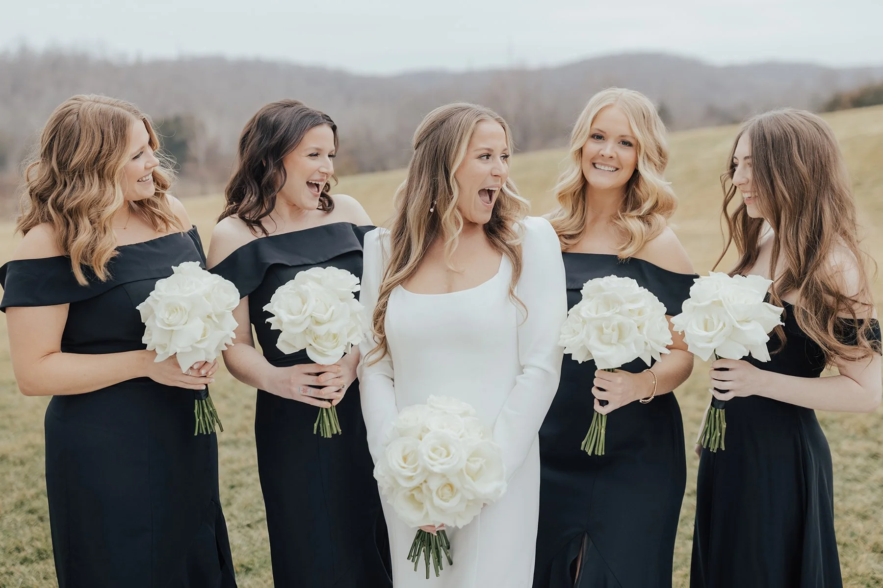 The floral design, provided by Belli Fiori, elevated the entire day. Rachel particularly loved the ceremony floral columns, which framed the couple beautifully during their vows. Another standout element was the white aisle runner, a last-minute addition that transformed the ceremony space and made a striking impact. The all-white floral palette popped against the black attire of the guests, creating a stunning visual contrast.